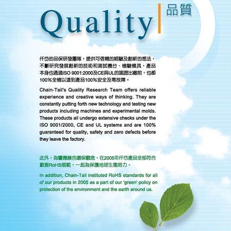 仟岱的品保研發(fā)團隊,提供可信賴的經驗及創(chuàng)新的想法,不斷研究發(fā)展新的技術和測試機臺、檢驗模具,產品本身也通過 ISO9001:2000 及 CE 和 UL 的認證出廠前,也都全檢以達到產品 安全及零故障。